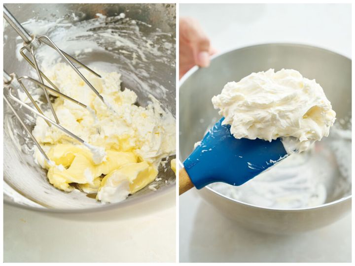 バターとメレンゲの温度を同じくらいにしておくと、脂分と水分が乳化し、しっかり混ざって堅くなっていきます。合わせる前にそれぞれ手でさわって温度を確かめてから、加えてみて。メレンゲの温度が高い場合は、さらに泡立てて温度を下げてください。