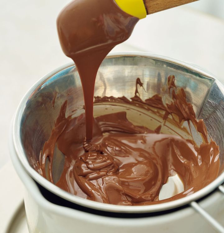 (1)チョコレートを細かく刻み、耐熱のボールに入れる。鍋に50℃の湯(沸騰したあと、同量の水を入れてもできる)を沸かし、ボールを重ねてチョコレートを溶かす。湯せんからはずし、人肌くらいになるまでさます。