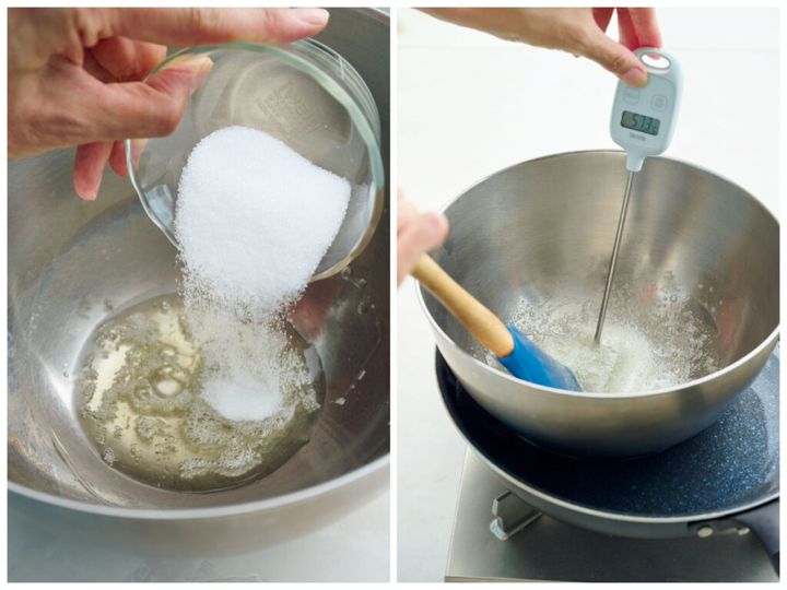 フライパンに湯1リットルを沸かし、火を止める。口径23cmのステンレス製のボールに冷蔵庫から出したての卵白とグラニュー糖を入れる。ボールの底を湯に当ててゴムべらで40~50秒混ぜると、60℃程度に。ただし、室温や卵白の温度によっては60℃にならない場合もあるので、できるかぎり温度計を使ってください。