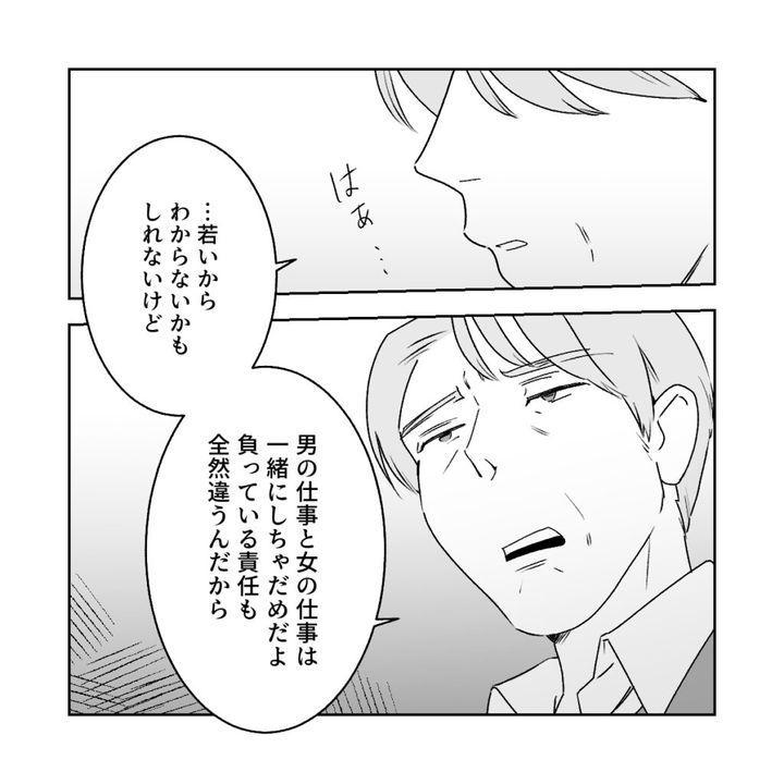 すると、「はぁ・・若いからわからないかもしれないけど、男の仕事と女の仕事は一緒にしちゃだめだよ。負っている責任も全然違うんだから」と蔑むような眼をして話す和男さんに、