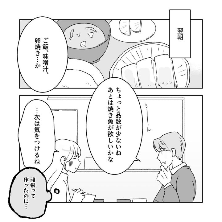 和男さんのリクエスト通りの和食を用意した私。すると、「ご飯、味噌汁、卵焼き・・か。うーん・・ちょっと品数が少ないね。あとは焼き魚が欲しいかな」といきなりのダメ出し。「・・次は気をつけるね」と答えつつ、「頑張って作ったのに・・」と全く褒めてくれない和男さんに対して心の中で呟きました。