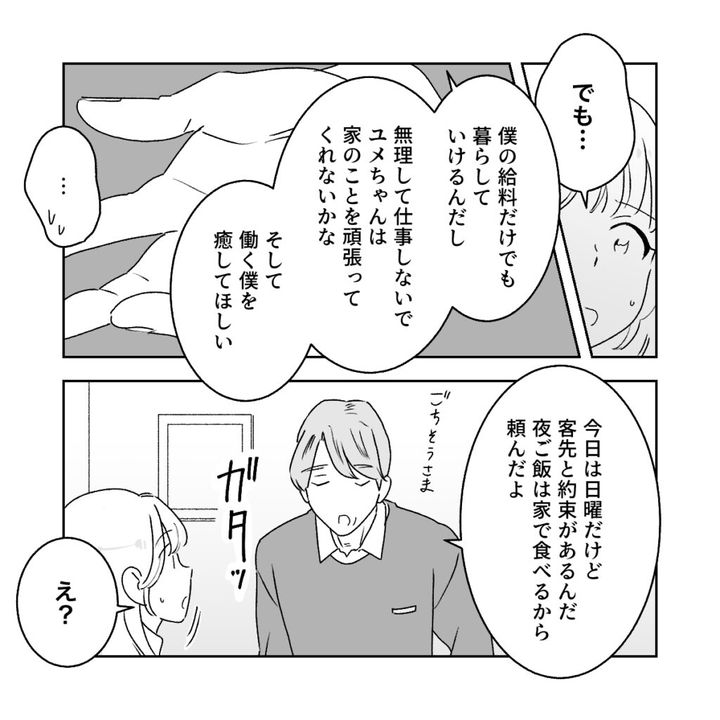 「でも・・」と反論しようとするも、「僕の給料だけでも暮らしていけるんだし、無理して仕事しないで、ユメちゃんは家のことを頑張ってくれないかな。そして働く僕を癒してほしい」和男さんにそう言われ、何も言えなくなる私に、「ごちそうさま。今日は日曜だけど客先と約束があるんだ。夜ご飯は家で食べるから頼んだよ」そう言って席を立つ和男さん。私は思わず「え?」と呟きました。