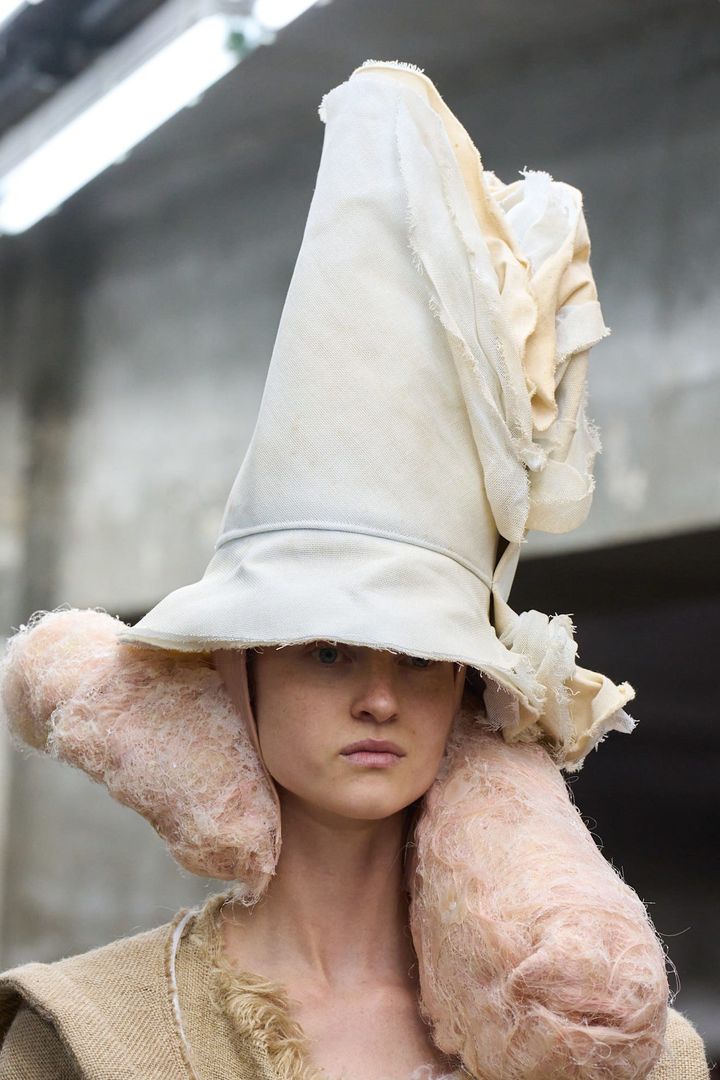 日爪ノブキ手掛ける「ヒヅメ」の帽子が今季もさまざまに登場し、ルックが語りかける言葉の一つとして独創的な存在感を放つ。