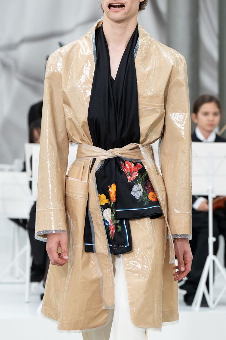 はがれかけたフラワー壁紙を思わせるモチーフは、16世紀から17世紀のペインティングから引用。型押しニットやシルクドレスに落とし込まれ、ドレープに沿って揺れるプリントがシワさえも意匠の一部へと昇華する。シルクスカーフをジャケットやコートに組み込んだ“パーマネントイブニング”は、装飾と構造の境界を溶かす試み。オペラを訪れる際のエレガントな装いを、グレン・マーティンスが独自の視点で解釈している。縫い留め、固定し、服と一体化させるというアプローチを反復しながら、その積み重ねが今季の美学を雄弁に物語っていた。マルタン・マルジェラの実験的プロセスを踏襲しながら、高度な技法をウェアラブルに落とし込む。グレン・マーティンスの次なる手腕がさえる、「メゾン マルジェラ」の新章が刻まれる。