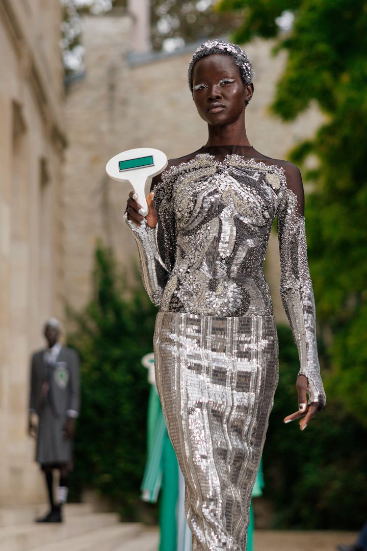 パッチワークのユニフォームやメタリックに輝くドレス、ゆがんだテニスルックへと展開し、ショーは奇妙で愛らしい“宇宙旅行”の趣を帯びる。「トム ブラウン」は、実験精神と高度な職人技を両立させながら、現実の輪郭をずらすことの快楽をあらためて提示した。