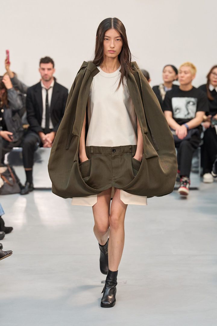 ショルダーが誇張されたブレザー、フリンジをあしらったロングコート、ドロップウエストのプリーツスカート。テーラリングは伝統の枠を超えて再構築され、プロポーションを大胆にずらすことで身体に新たなリズムを生み出す。シグネチャースーツには追加の腕や脚穴が加えられ、まるで異星生命体かのようなフォルムがランウェイを漂った。