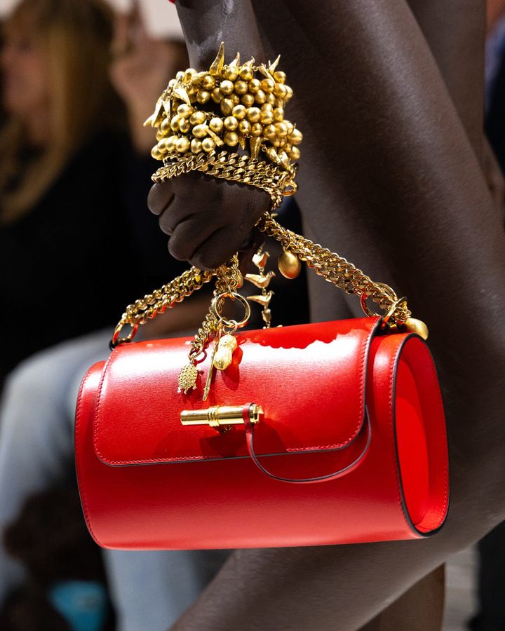 バッグはアーカイブ“デ・マンタ”を再解釈した幾何学的なシルエットに、マザーオブパールや手彫りのタリスマンを組み合わせた。ジュエリーにはウィッシュボーンといった自然由来のモチーフを配し、服の世界観にさらなる奥行きを与える。ランウェイは、人間の本能と欲望がむき出しになる官能的な物語として幕を閉じた。