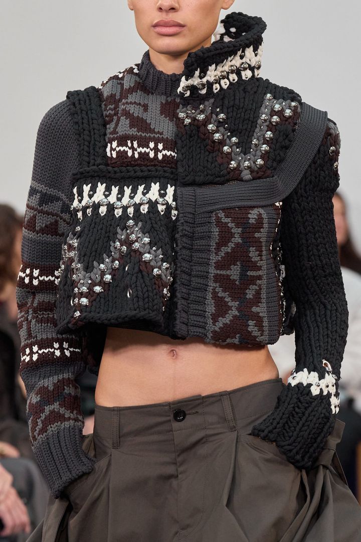 ブランドを象徴するドッキングはさらに大胆かつ細やかにルックに織り込まれ、過去と未来をつなぐ「サカイ」のアイデンティティーとして確固たる存在感を放つ。Tシャツ、シャツ、カットソー、テーラード、トレンチコートやボトムといったあらゆるアイテムが編集され、独自の個性を放つ一方で、濃密な手仕事を感じさせるニットウエアはクチュールのアプローチがさえ、ブランドらしいを物語る進化の象徴として君臨。また、ボトムの広がる裾を上に折り返し、ドレスのように仕立てるルックが多数登場し、コレクションの核を担う存在感を放っていた。