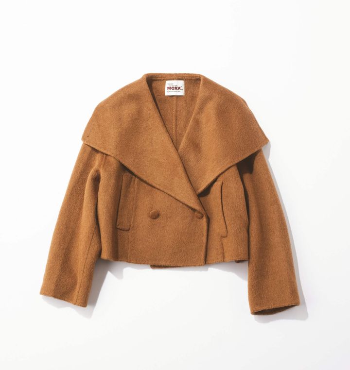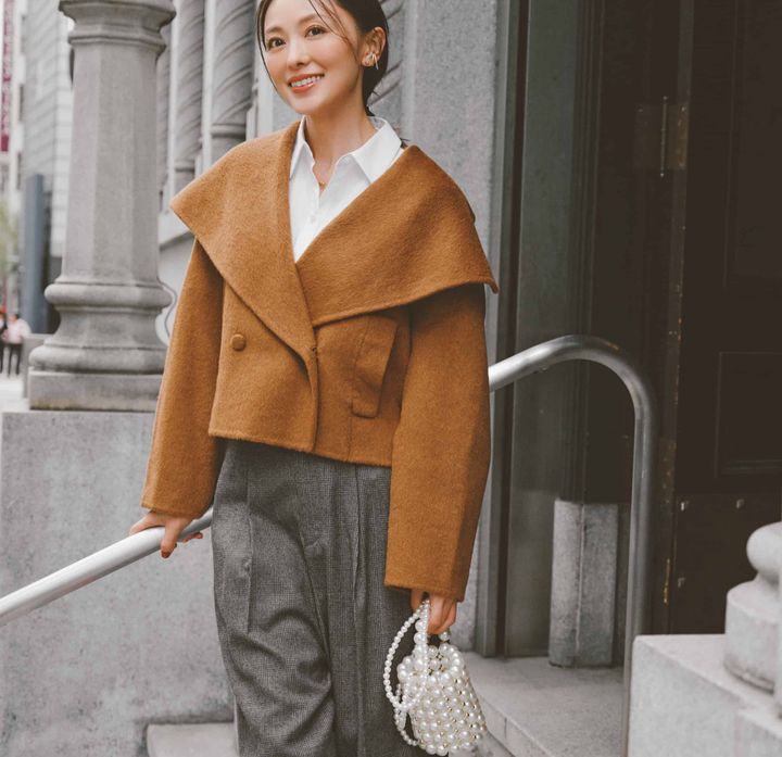 大きめの襟が顔まわりを華やかに見せてくれる一枚。コンパクトな丈感で脚長バランスもバッチリ。キャメル寄りのブラウンはどんなボトムスともなじみ、甘辛どちらにも振れる柔軟さが40代の味方です。