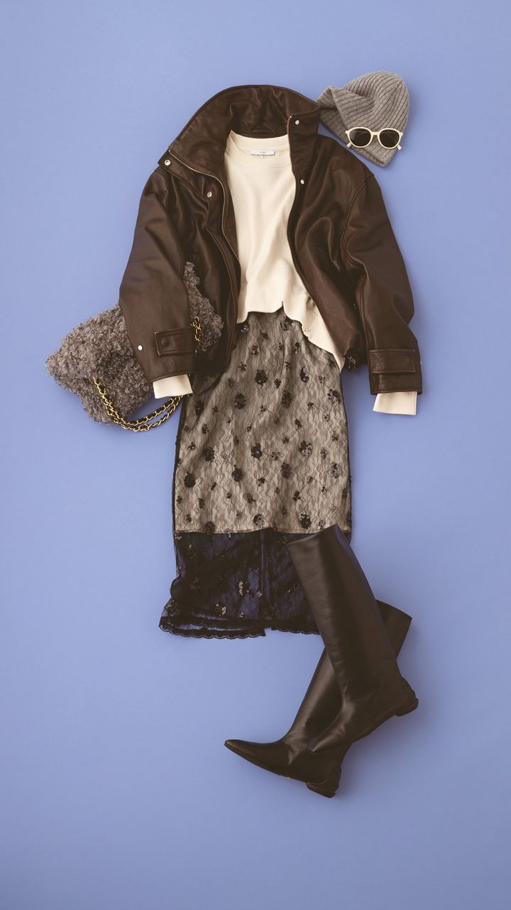 スカート¥24,200レザージャケット¥52,800(ともにプランクプロジェクト 青山店)スウェットトップス¥29,920(アストラット/アストラット新宿店)バッグ¥24,200(ヴィオラドーロ/アルアバイル)ブーツ¥69,300〈シーセイ〉ニット帽¥19,800〈アソース メレ〉(ともにアイネックス)サングラス¥23,800(カリン)