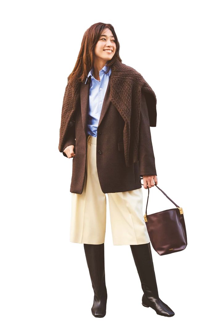 ジャケット¥105,600(エブール/リトルリーグ インク)肩がけしたニット¥31,900(カレンソロジー/カレンソロジー 二子玉川)シャツ¥49,500(オブリオ)ハーフパンツ¥49,500(デパリエ/デパリエ 伊勢丹新宿店)バッグ¥37,400(オルセット/アンタイトル)ブーツ¥69,300(シーセイ/アイネックス)ネックレス¥19,800(チビ・ジュエルズ/チビジュエルズ・ジャパン)