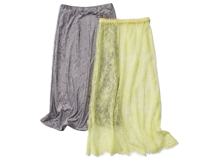 その日の気分で表情が変えられる両A面の重ね着スカート。洒落感を添えてくれる重ね着アイテムは早めにスタメン入りさせます。
