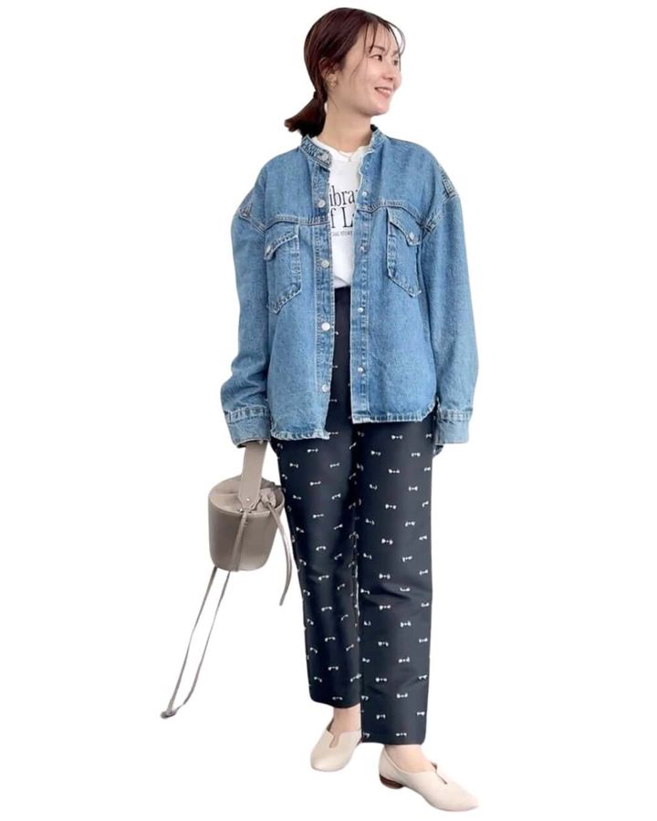 ロゴロンTとデニムジャケットでカジュアルにも◎甘めなキレイめパンツとカジュアルのミックスがバランス良くオススメです!
