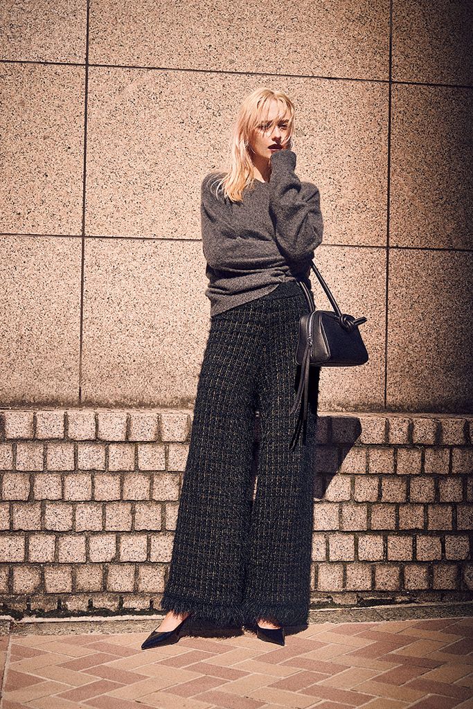 ツイードのような編み地で、ニットのラクさは保ちつつエレガントに昇華。目のつまった厚手の生地がまっすぐなラインを維持し、理想的な脚線を演出。黒以外の色の糸が織り交ぜられていて、さりげなく柄のように。表面はふわふわとけば立ちがあるため、ダークトーンのトップスを組み合わせても重たく見えず、フリンジのついたすそが華やかさをあと押し。