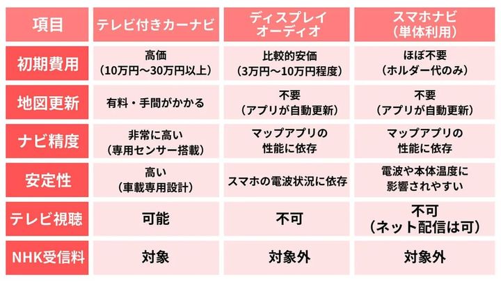 スマホアプリなら地図は常に最新で無料。音楽や動画配信サービスも車内で手軽に楽しめます。「テレビを見ない」「地図更新が面倒」という方は、高価なカーナビをやめて、スマホ+ディスプレイオーディオへの移行を検討してみてはいかがでしょうか。