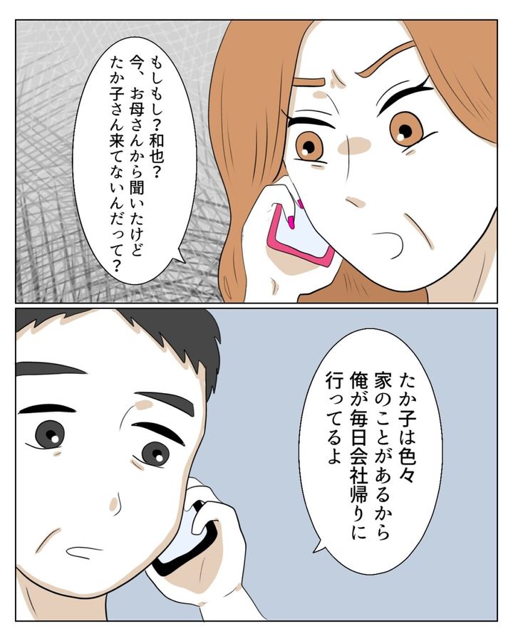 「もしもし和也?お母さんから聞いたけど、たか子さん来てないんだって?」怒りをにじませた表情で、エミさんはそう切り出しました。和也さんは、「たか子は色々家のことがあるから、俺が毎日会社帰りに行ってるよ」と、さりげなく私をかばってくれます。