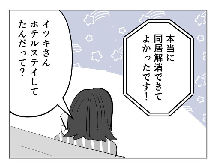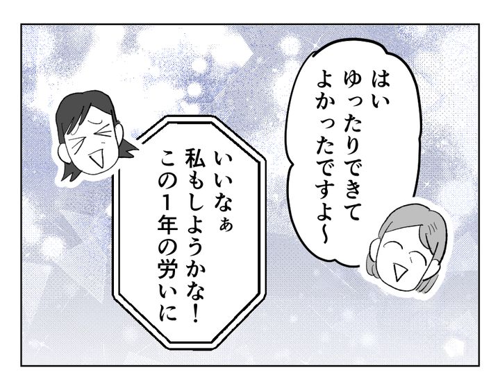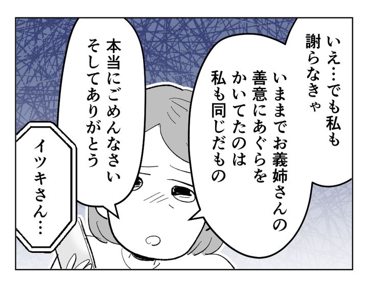 イツキさんはアラフィフのパート主婦。夫コウタさんが勝手に2週間、義母を自宅に泊めると約束したことで、「ホテル暮らしをして義母の世話をしない」という逆襲をしました。わがまま義母と人任せのコウタさん、案の定ケンカが絶えず、予定より早く帰ったところ、同居していた義姉(コウタさんの兄の妻)も義母のお世話がイヤで逃亡。義兄、コウタさんともに義母の世話はできないとやっと認め、義母を一人暮らしをさせることになりました。そして現在、義姉と嫁同士の会話中です。