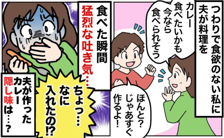 しばらくして、寝てしまっていた私を夫が起こしてくれて、カレーを持ってきてくれました。少し寝ぼけながら、カレーを食べてみると突然、激しい吐き気に襲われ、思いきり嘔吐。
