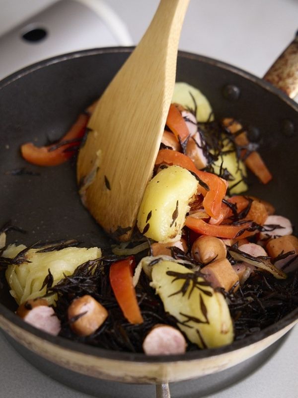 先に玉ねぎをしっかり炒めて甘みを引き出してから、じゃがいもやひじきを加えて。