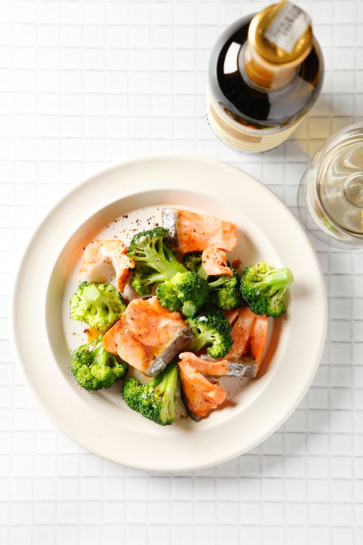 耐熱皿に、ブロッコリー5~6房、塩鮭2切れをひと口大に切ってのせ、ラップをして電子レンジで5分加熱。水気を捨て、バター10g をのせ、ポン酢小さじ1を回しかける。