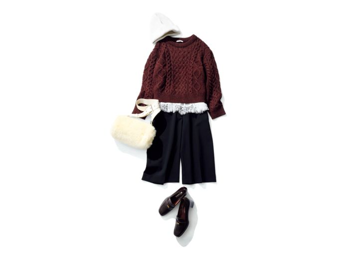 バミューダパンツ¥7,990/ZARA(ザラ) レースキャミソール付きチュニック(キャミソール)¥23,100/アプワイザー・リッシェ ケーブルニット¥2,990/GU ファーバッグ¥7,900/Olu. コインローファー¥18,150/ダイアナ(ダイアナ 銀座本店) ニット帽¥3,990/アンフィーロ(オンワード樫山)