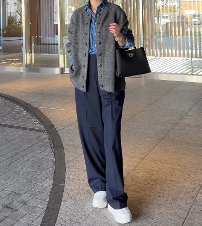 ボトムには深みのあるネイビーのワイドパンツを合わせ、全体をブルー系のグラデーションでまとめているのが印象的。重たくなりがちな冬の配色も、足元にボリュームのある白スニーカーを投入すれば一気に軽やかな雰囲気に。厚手のカーディガンは前後2WAYで使えるタイプを選んでおり、着回しの幅が広がる一枚です。かっちりした黒のバッグで全体を引き締めれば、ラフすぎない大人の休日スタイルが完成しました。