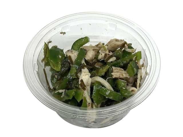 食感の良いぐしちゃんピーマンと刻み昆布蒸し鶏に鶏ガラスープ胡麻油を和えたました。おつまみにもなる冷製惣菜です。 カロリー:58kcal 【販売地域】沖縄