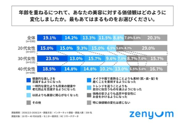 調査の最後、「年齢を重ねるにつれて、美容に対する価値観はどのように変化したか」を尋ねる設問の回答では1位が「特に価値観の変化は感じない」で20.3%、2位が「健康的な美しさを意識するようになった」で19.1%、3位が「メイクや服で着飾ることよりも素材(肌・歯・髪)を磨くことを重視するようになった」で14.2%という結果になりました。