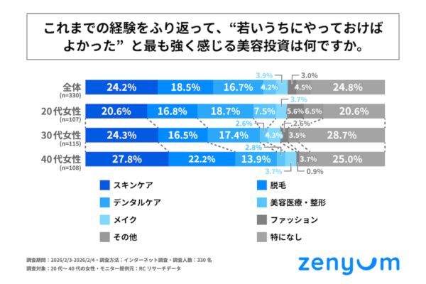 続いて「これまでの経験をふり返って、“若いうちにやっておけばよかった”と最も強く感じる美容投資は何か」を尋ねる設問への回答では、「特になし」という回答が最も多かったものの、それを除くと1位が「スキンケア」で24.2%、2位が「脱毛」で18.5%、3位が「デンタルケア」で16.7%という結果になりました。