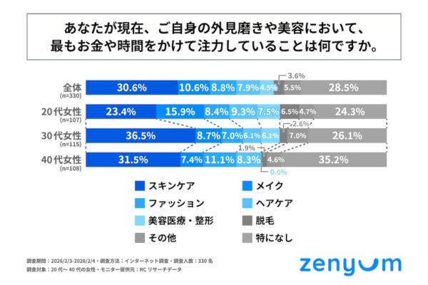 次に「現在、自身の外見磨きや美容において、最もお金や時間をかけて注力していることは何か」を尋ねる設問の回答では、1位が「スキンケア」で30.6%、2位が「特になし」で28.4%、3位が「メイク」で10.6%という結果になりました。