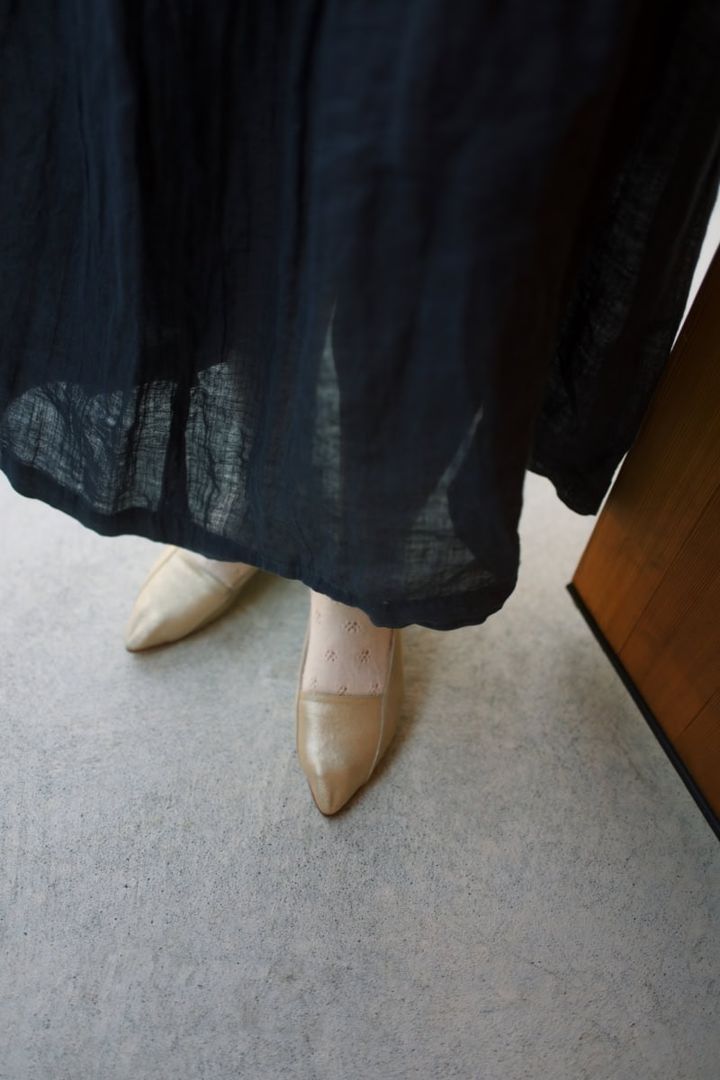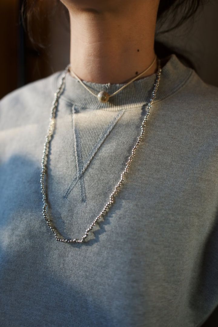「PURのスウェットトップスは、たっぷりとしたパフスリがチャームポイント。カジュアルになりすぎないので、大人でも着こなしやすいアイテムです。ネックレスを重ね付けして、アクセントに。クールなカラーが魅力のフレアスカートは、ギャルソンのヴィンテージ。軽やかな素材なので、今の季節はタイツと合わせて暖かく!」(PURデザイナー・八木下泉さん)