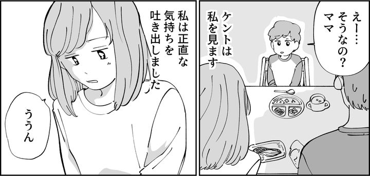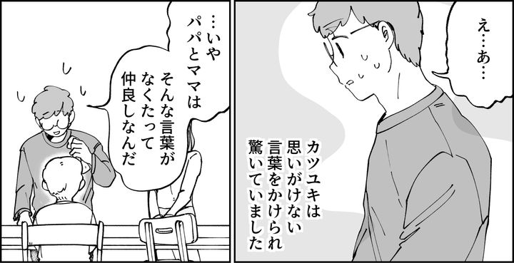 私はケントの言葉に背中を押され、正直な気持ちを吐き出しました。「そのうち仲良くできなくなっちゃうかもしれない」さすがにカツユキもたじろいでいます。親としてお手本を見せていたつもりが、子どもの方から注意されてしまったのです。