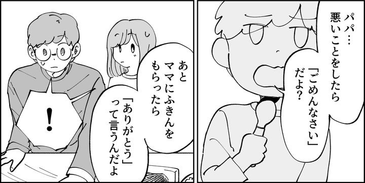ケントの目には「父親がとても無礼な人間」として映っていたのです。日頃から「ありがとう」や「ごめんね」の言葉は大事だと教えられていたから、そのとおり注意したのでしょう。まだ幼いケントに指摘されて、カツユキもさすがにビックリしたようです。慌てて「言葉がなくたって仲良しなんだ」と取りつくろっていました。