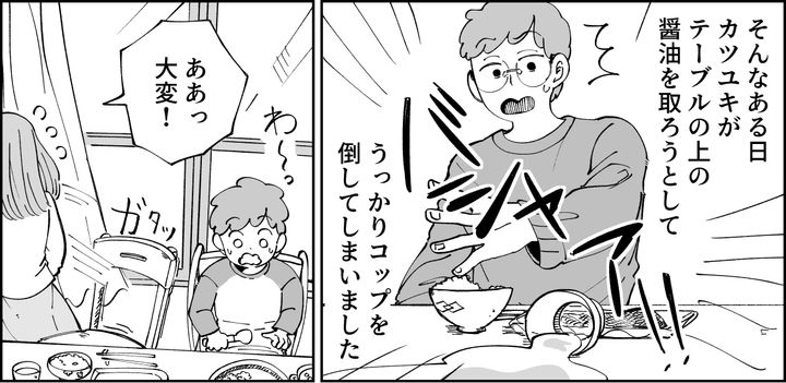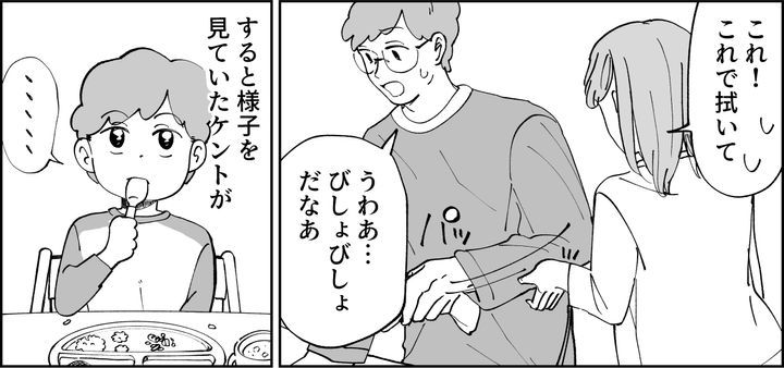 カツユキは自分でコップを倒しておきながら、「びしょびしょだなぁ」とまるで他人事のように言いました。私がふきんを渡しても、当たり前のように私の手からサッと取っただけ。ケントはそんな父親の姿に違和感を抱いたのでしょう。