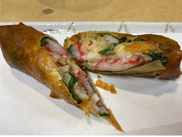 アツアツの皮の中には具がぎっしり!海老、ホタテ、カニカマのそれぞれの食材の旨味が大爆発!口の中を火傷してでもアツアツを頬張りたい一品です。
