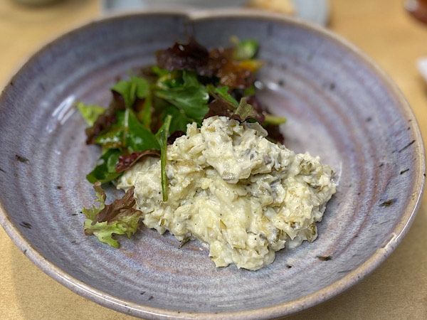こちらももちろん市販品ではなく手作り。ピクルスが入った温かいポテトサラダです。ボリューミーでしたが食べ終えるのが惜しいくらい美味です。