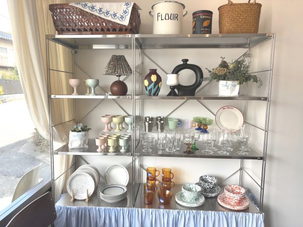 もうひとつ、楽しみにしていたのは、数々の食器類やインテリア雑貨です。店主さんが自ら韓国やタイまで買い付けに行かれた、こだわりの品々。素敵なデイスプレイと共にたくさん並べられていて、お店の可愛らしくやさしい雰囲気にすっと溶け込んでいます。