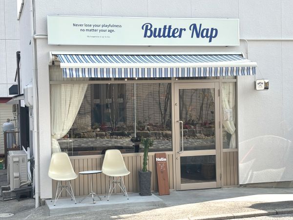 お店の名前は「Butter Nap (バターナップ)」 場所は広島市安佐南区西原にあります。シンプルだけど、とても可愛らしくて爽やかな外観。ワクワクします。