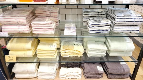 そして贈り物で断トツ人気だというのが「プレミアムタオルシリーズ」。ホイップクリームのようになめらかで、もっちりした肌触りが特徴で、シンプルな無地柄とストライプ柄があります。ハンドタオル、フェイスタオル、バスタオルに加え、無地柄のみヘアバンドも用意。贈り物にタオルを、自分用にはヘアバンドを買って行くという人もいるとか。
