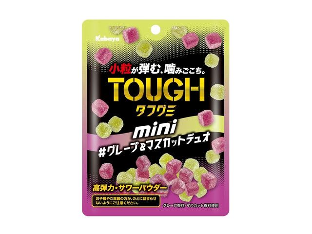 ■高弾力で厚みのあるキューブ型による噛みごこちの良い弾力品質と、食べ始めに感じるサワーパウダーのパンチ、程よい甘みをアソートで楽しめる、『タフグミ』ならではのやみつきのウマさ ■『タフグミ』のウマさの秘訣はそのままに、食べやすい小粒サイズ ■ジューシーでパンチの効いた刺激のグレープとマスカットの2種アソート ファミリーマート先行販売