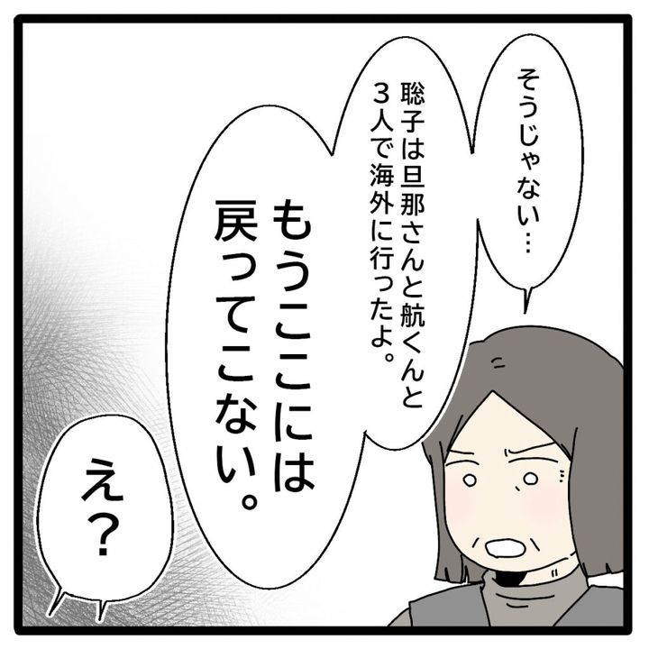 「そうじゃない・・。聡子は旦那さんと航くんと3人で海外に行ったよ。もうここには戻ってこない」お母さんがきっぱりそう言うと、「え?」と2人して驚き、