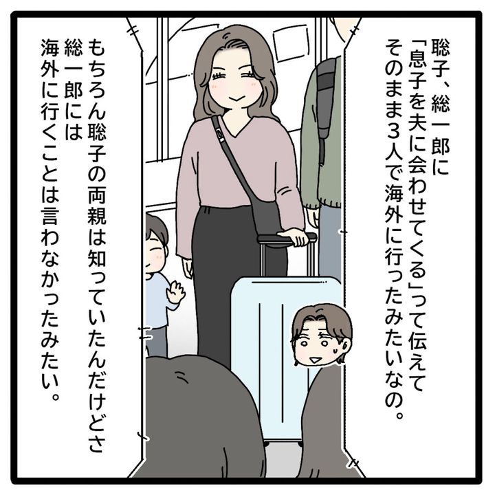 すると、「聡子、総一郎に『息子を夫に会わせてくる』って伝えて、そのまま3人で海外に行ったみたいなの。もちろん聡子の両親は知っていたんだけどさ。総一郎には海外に行くことは言わなかったみたい」と美沙ちゃんが詳しく話してくれました。