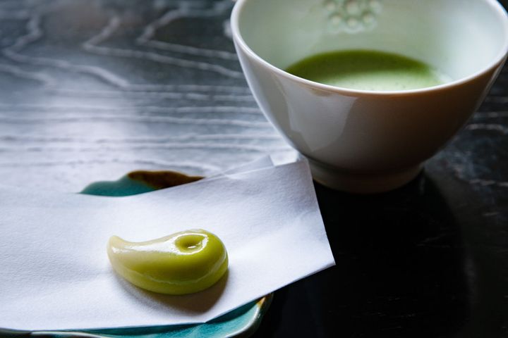 勾玉の練きりはやさしい甘み。お抹茶と合います。