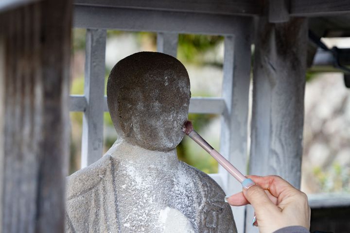 奉納後、筆におしろいを取り、お地蔵さまのお身体の、自分の治したい部分と同じところにおしろいをつけます。私は顔とからだ両方をお願いしました。その昔、和尚さんがお地蔵さまにおしろいを塗って祈ったところ、顔面のあざがきれいに治ったことが始まりと伝えられています。私も美人になれる、はず。