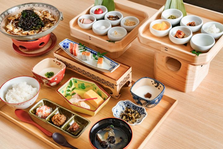 三方に盛りつけられ神饌朝食は、通常の朝食と合わせて食します。神様に備える御饌を再現したもの。禊湯にも入り、神饌も頂き、準備万端。
