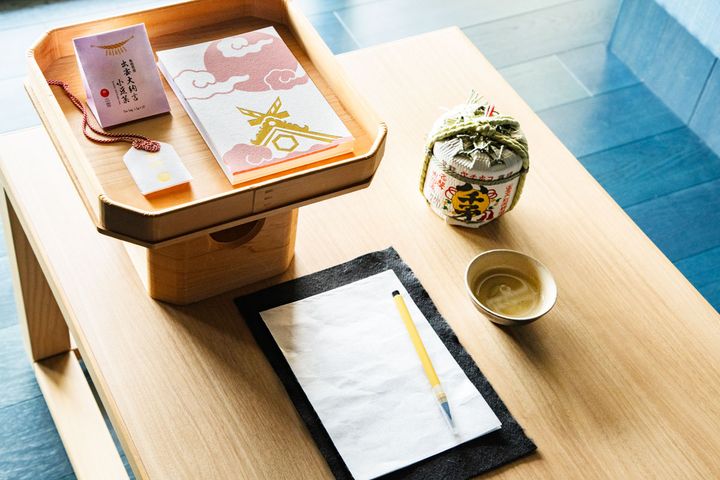 「冬限定:出雲大社お詣り支度プラン」を選んだゲストの客室には「お詣り支度セット」が用意されています。出雲大社の御神酒として使用される日本酒「八千矛(やちほこ)」、オリジナル御朱印帳、かみまもり、石州和紙の「願い和紙」です。 到着後はまず御神酒で心身を清め、滞在中には「願い和紙」に願い事を記します。厄除けとして伝わる小豆の開運茶をお供に、願いを込めた和紙を「かみまもり」に納め、心願成就を祈る参拝へと備えることができます。