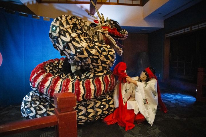 界 玉造の「石見神楽」の演目は、須佐之男命が大蛇(おろち)退治をするために、酒造りをする物語。大蛇が所せましと暴れまわる迫力ある演目です。酒どころだから「古事記」「日本書記」の中にも出てくる八塩折の酒(やしおりのさけ)のエピソードの神楽を上演しています。観客のゲストとの掛け合いも楽しく、見応えたっぷりです。