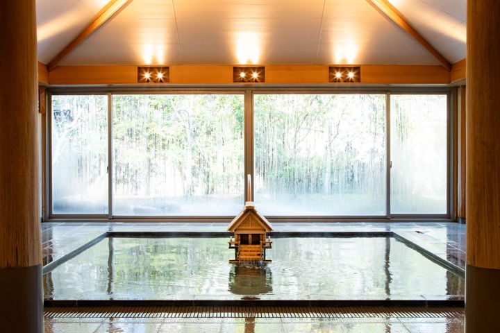 「界 玉造」のアイコニックな大浴場。1300年前に編纂された『出雲国風土記』にも「一たび濯げば形容端正しく、再び沐すれば万病悉く除ゆ(一度入ると美しくなり、再び入ると万病が治る)」と記されている玉造温泉は、いにしえから伝わる美人の湯です。