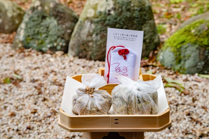 「八重垣神社開運プラン」のゲストの客室には、真菰を用いたオリジナルのバスセット、松江の老舗「秀玉堂」が手掛けた、界 玉造オリジナルの勾玉チャーム付きお守り袋を用意。八重垣神社で受けたお守りを大切に持ち帰るためのかわいいお守り袋です。