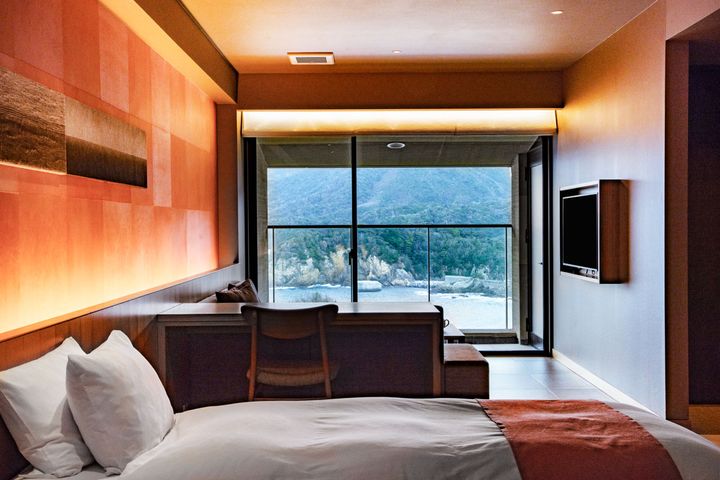 朝日が望める出雲松島側のお部屋。お部屋のアクセントは朝日をイメージ。ベッドエリアと窓際のリビングエリアの動線がよく、使いやすい。ソファに座って絶景を見るだけで心がほどけていきます。